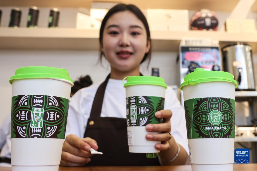 10月25日,店員在“村BA”主題茶飲店內擺放制作好的飲品。