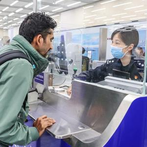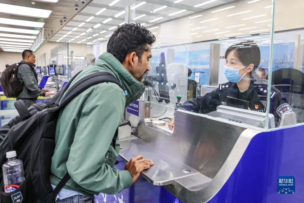 10月25日,在青島膠東國際機場(chǎng),一位外籍旅客在山東出入境邊防檢查總站青島機場(chǎng)邊檢站辦理入境通關(guān)手續。