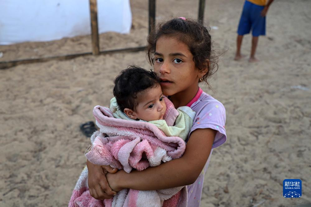 這是10月25日在加沙地帶南部一處收容流離失所巴勒斯坦人的臨時(shí)營(yíng)地內拍攝的兒童。
