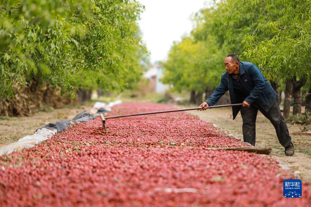 10月7日,山東省樂(lè )陵市朱集鎮后朱村棗樹(shù)合作社社員在晾曬小棗。