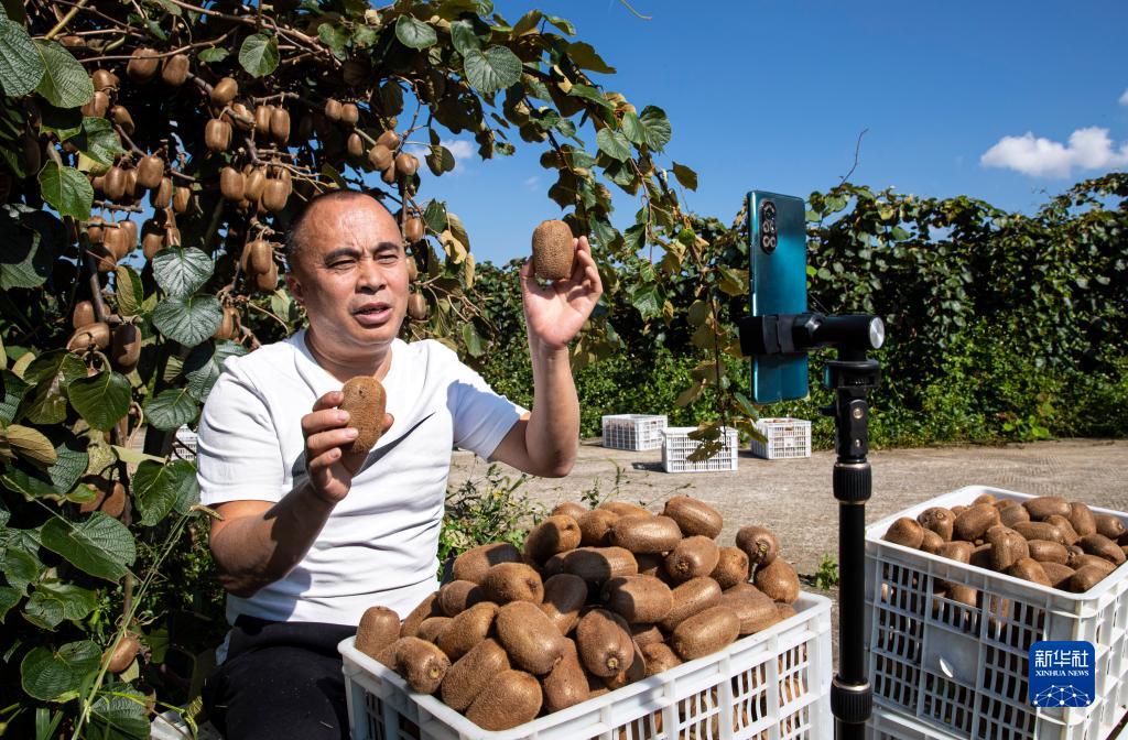 10月16日,村民在貴州省黔西市林泉鎮海子社區生態(tài)農業(yè)園直播銷(xiāo)售獼猴桃。