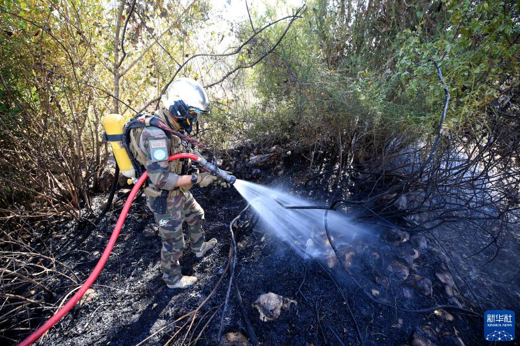 10月26日,聯(lián)合國駐黎巴嫩臨時(shí)部隊士兵在黎巴嫩阿勒馬沙卜的以軍炮擊地點(diǎn)滅火。