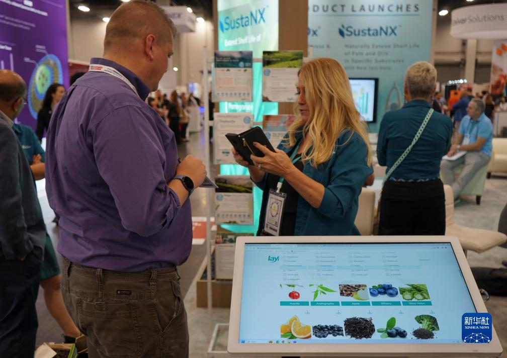 10月25日,在美國拉斯維加斯2023年中國醫藥原料品牌展上,人們參觀(guān)桂林萊茵生物展區。