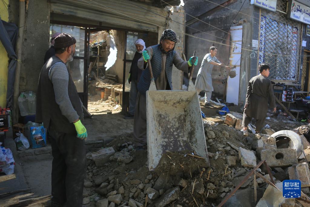 10月27日,在阿富汗首都喀布爾,人們在爆炸事件后清理磚瓦。