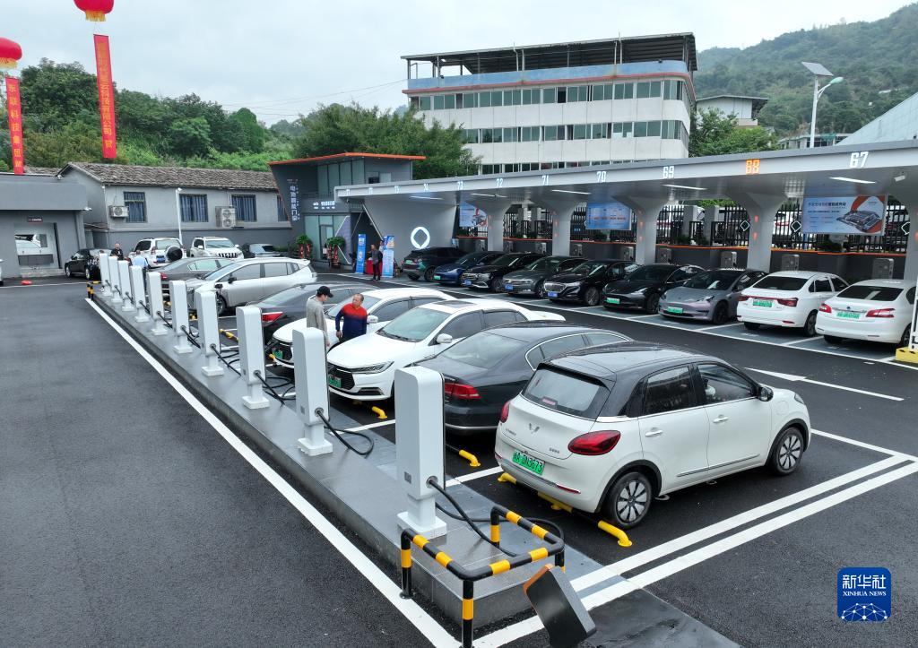 10月27日,新能源汽車(chē)在福州市倉山區齊安路的齊安智檢超充站充電(無(wú)人機照片)。