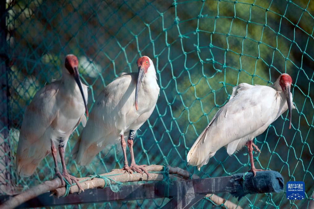 10月26日在江蘇鹽城濕地珍禽國家級自然保護區朱鹮野化訓練籠舍拍攝的待放飛的朱鹮。