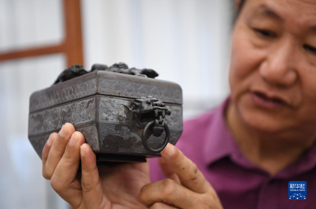 10月10日,在廣東肇慶柳新祥端硯藝術(shù)館,柳新祥講解“仿西周·簠形雙獅戲球套硯”的特點(diǎn)。