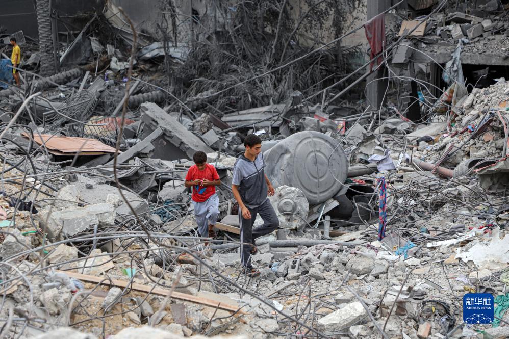 10月27日,在加沙地帶南部城市汗尤尼斯,人們查看建筑廢墟。