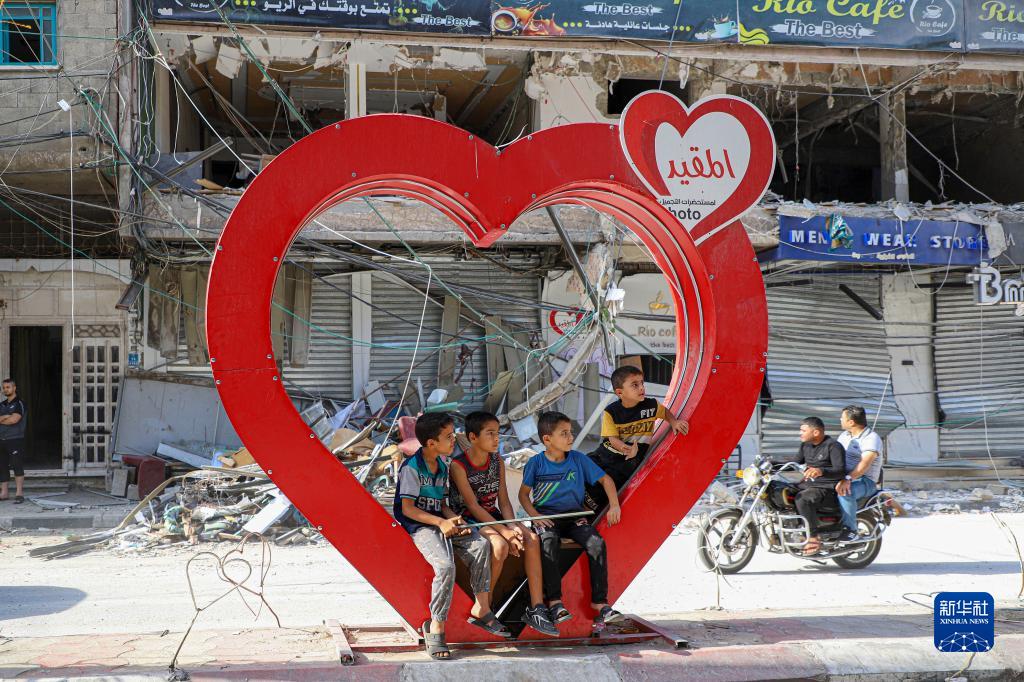 10月22日,在加沙地帶南部城市汗尤尼斯,幾名兒童坐在一處心形設施上,身后是遭以色列空襲損毀的建筑。
