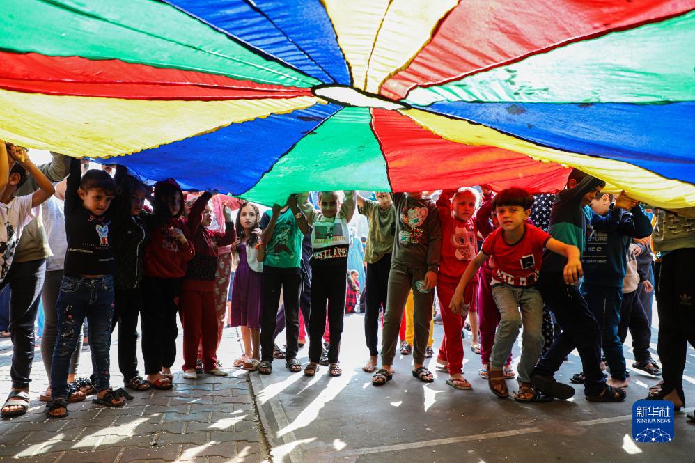 10月23日,在加沙地帶南部,兒童在聯(lián)合國近東巴勒斯坦難民救濟和工程處一所附屬學(xué)校內做游戲。