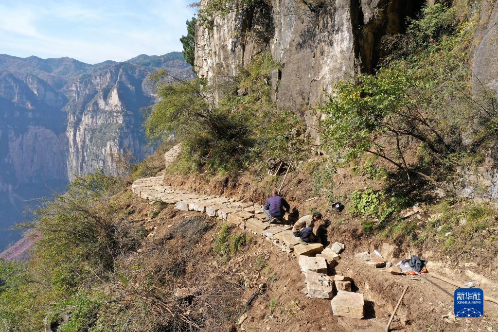 在壺關(guān)縣大峽谷鎮青龍峽村,村民們在山上修路(10月17日攝,無(wú)人機照片)。
