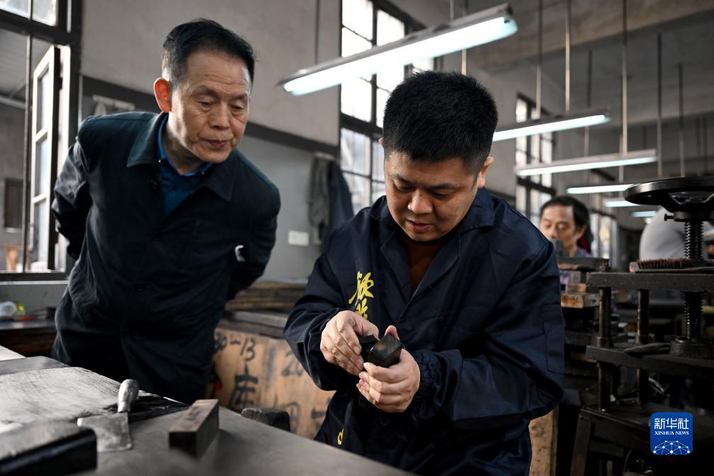 10月24日,在安徽省黃山市歙縣老胡開(kāi)文墨業(yè)有限公司,周?。ㄓ遥┰诟赣H周美洪的注視下從墨模中取出壓制好的墨。