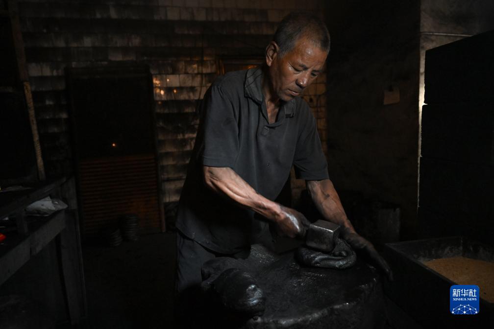 10月25日,在安徽省黃山市歙縣老胡開(kāi)文墨業(yè)有限公司,工人將骨膠與煙灰混合后的墨泥錘打成墨餅。