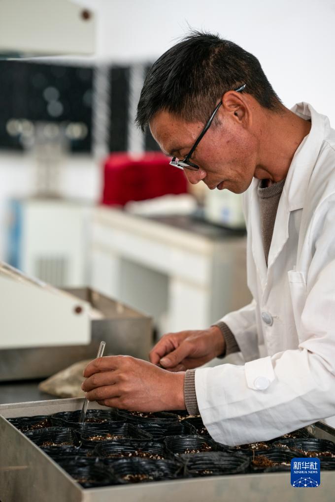 技術(shù)員田連通在實(shí)驗室播種太空種子(4月3日攝)。