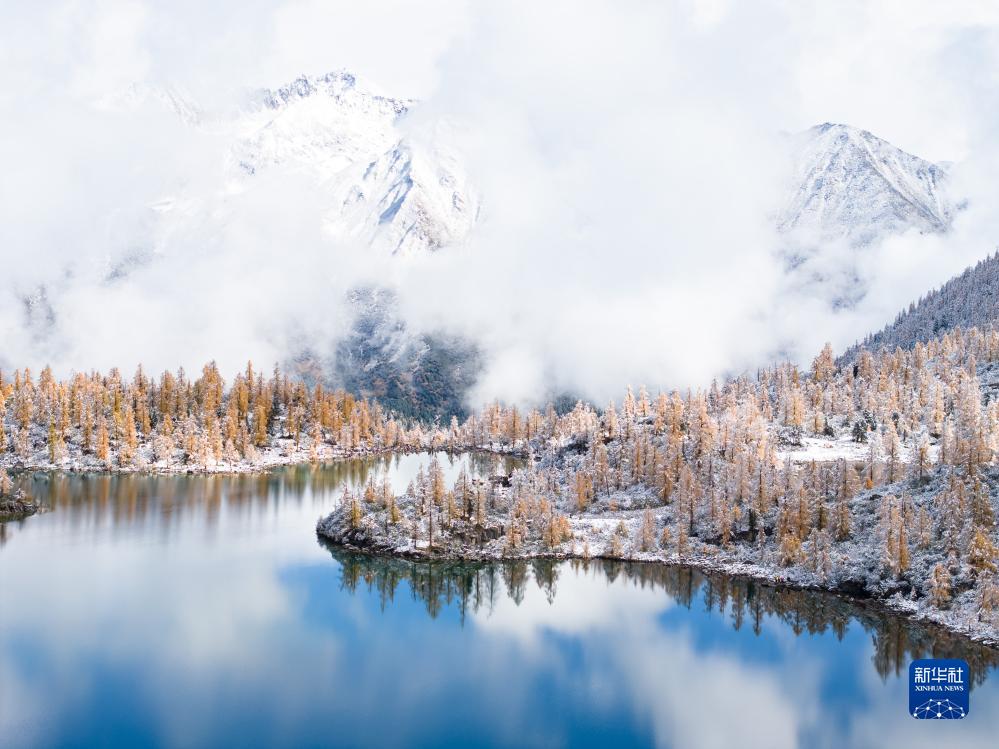 雪山和黨嶺村葫蘆海、彩林構成一幅優(yōu)美的畫(huà)卷(10月27日攝,無(wú)人機照片)。