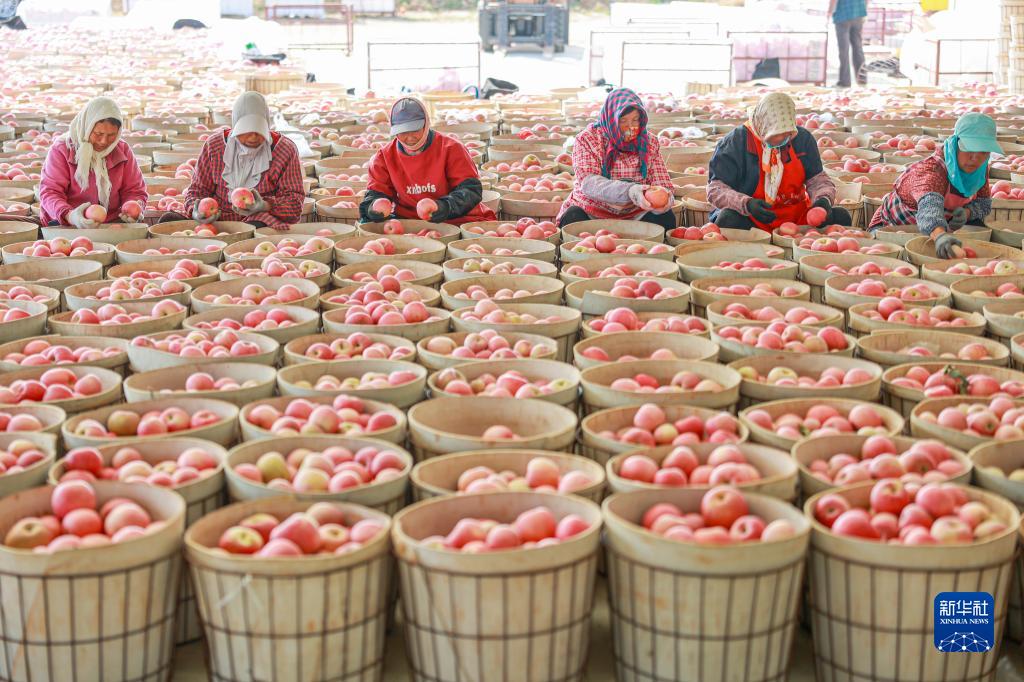 10月28日,在山東省榮成市夏莊鎮一處蘋(píng)果園,果農們在分揀、裝運蘋(píng)果。