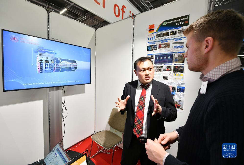 10月28日,在德國紐倫堡,一名山東大學(xué)工作人員向參觀(guān)者介紹一款智能盾構系統。