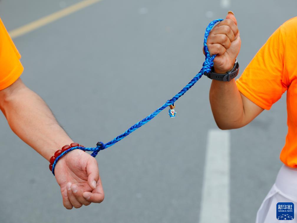 參加2023成都馬拉松全程比賽的“黑暗跑團”視障跑者韓宇(左)與他的陪跑志愿者通過(guò)一根陪跑繩聯(lián)結在一起(10月29日攝)。新華社記者 沈伯韓 攝
