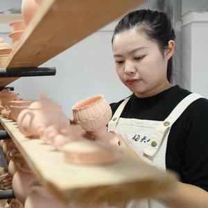 “95后”陶瓷夫妻檔季雙俊和季資美是高中和大學(xué)時(shí)的同學(xué),因為共同的興趣走到一起。從景德鎮陶瓷工藝美院畢業(yè)后回到故鄉龍泉,夫妻二人在甌江旁的爐田村駐扎下來(lái),成立了“梅夫人”工作室,潛心鉆研北宋風(fēng)格的青瓷器。兩人從古瓷中尋找靈感,力圖重現北宋龍泉窯的胎釉特點(diǎn),并借鑒青銅器、金銀器、古代服裝上的紋樣,在瓷上傾注對傳統文化的熱愛(ài)。