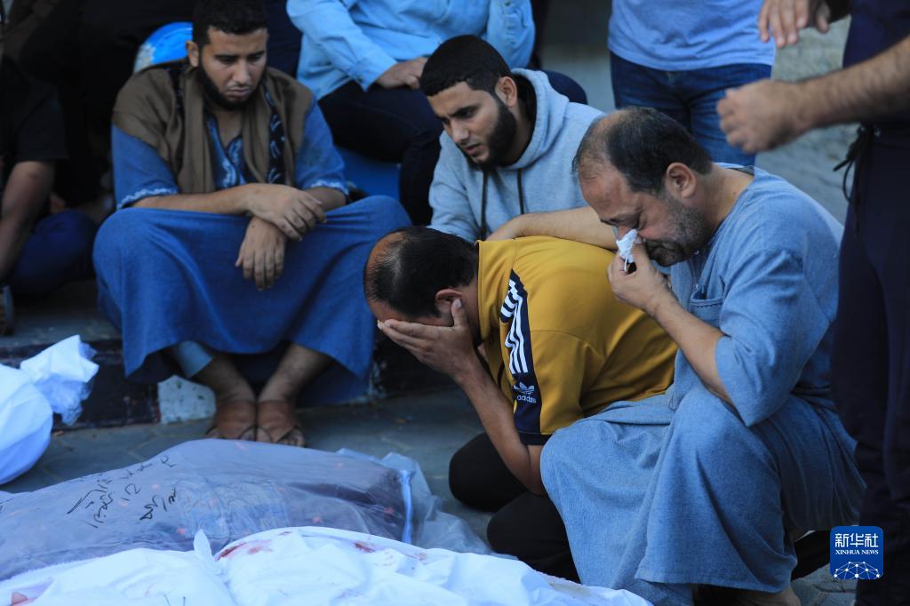 10月31日,在加沙地帶中部城市代爾拜拉赫,人們在失去親友后痛哭。