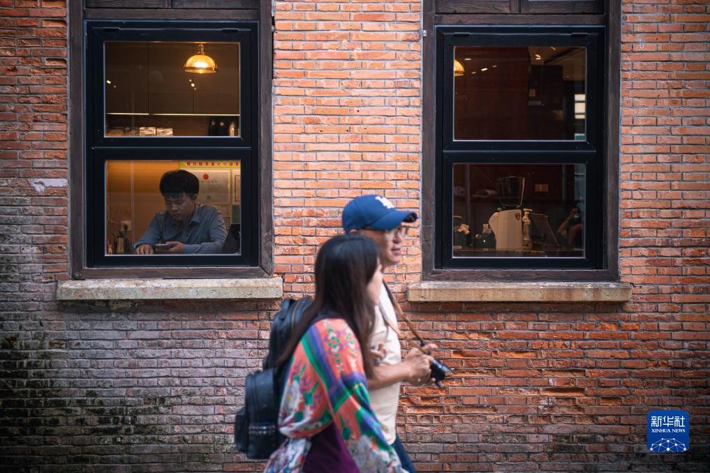 10月31日,游客經(jīng)過(guò)寧波老外灘步行街一處由歷史建筑改造而成的咖啡廳。