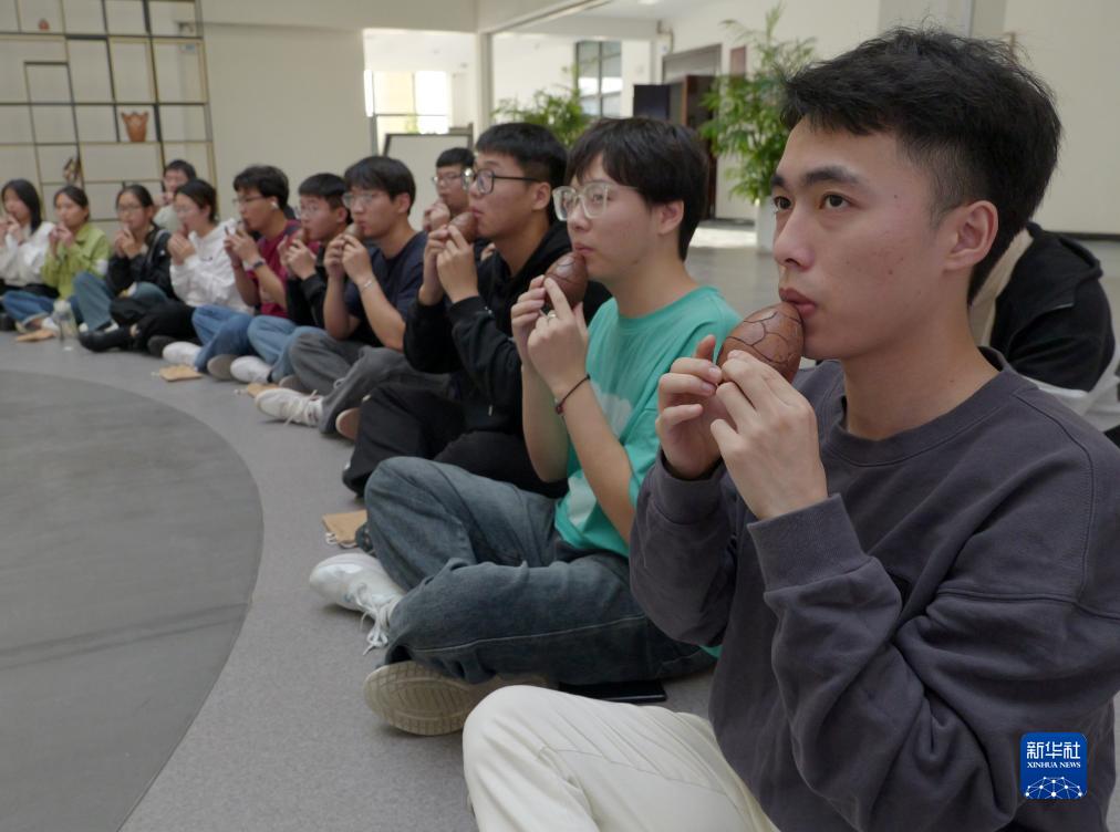 10月31日,在河南省武陟縣黃河交通學(xué)院黃河文化館內,學(xué)生在練習吹奏黃河泥塤。