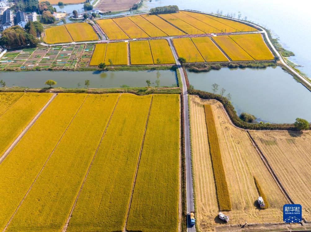 10月31日,在江蘇省昆山市錦溪鎮顧家浜村,農機在田間收獲水稻(無(wú)人機照片)。
