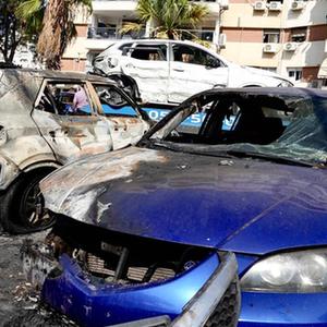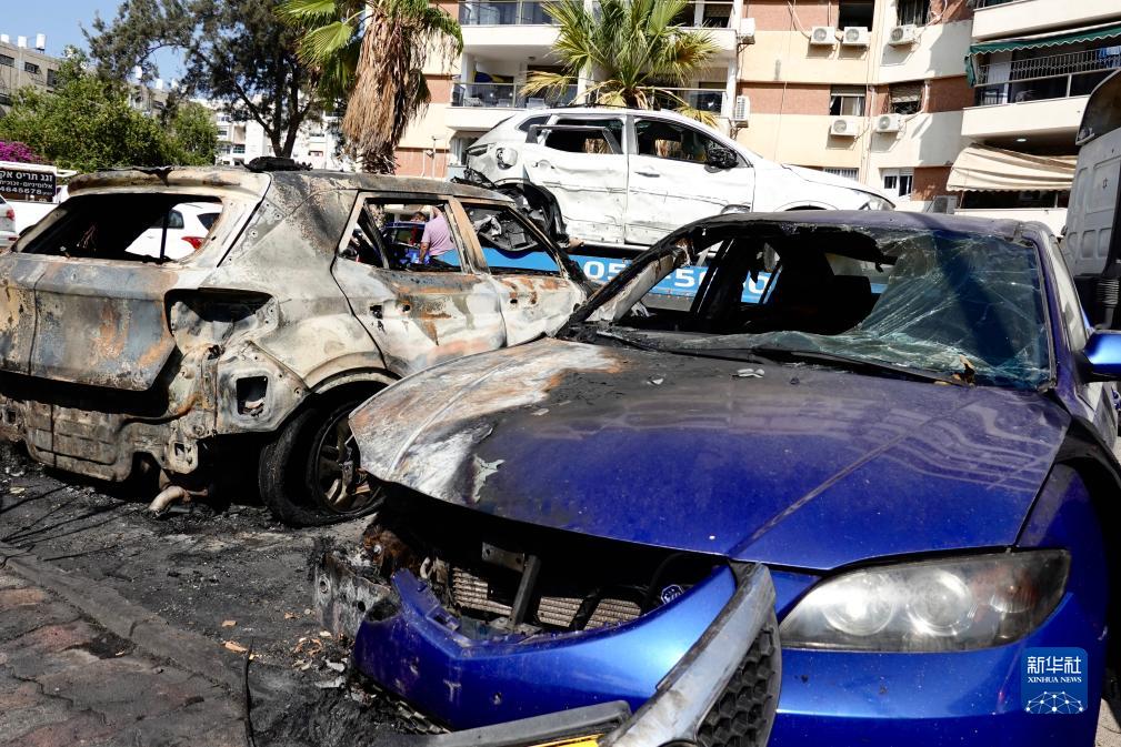 這是11月1日在以色列南部城市阿什杜德拍攝的遭火箭彈襲擊后損毀的車(chē)輛。