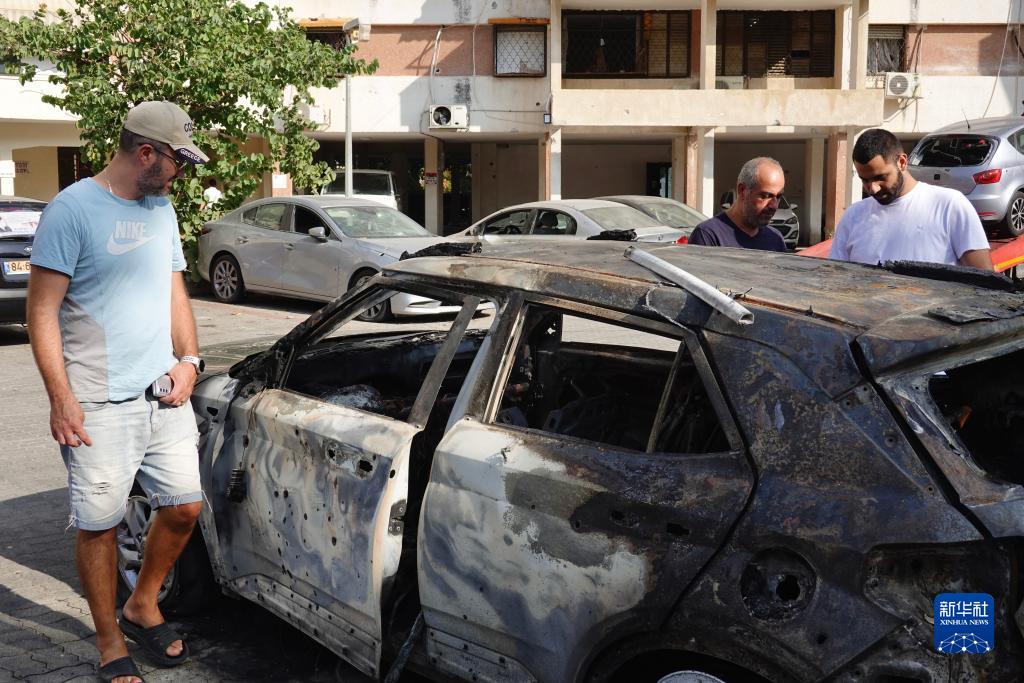 11月1日,在以色列南部城市阿什杜德,人們查看遭火箭彈襲擊后損毀的車(chē)輛。