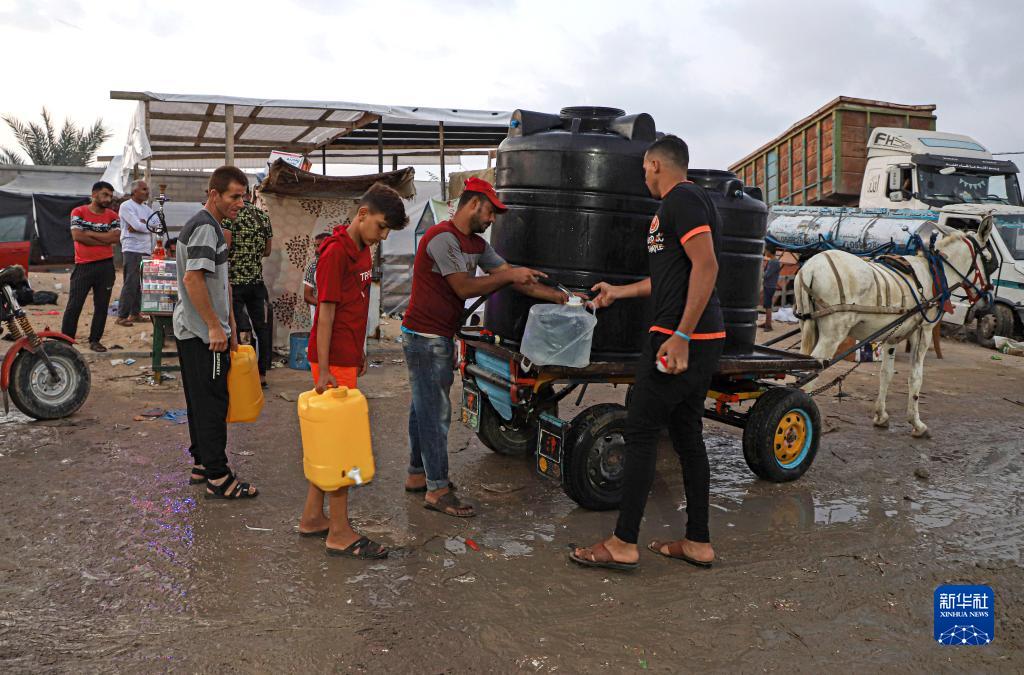 11月1日,流離失所的人們在加沙地帶南部城市汗尤尼斯的一處臨時(shí)難民營(yíng)地取水。