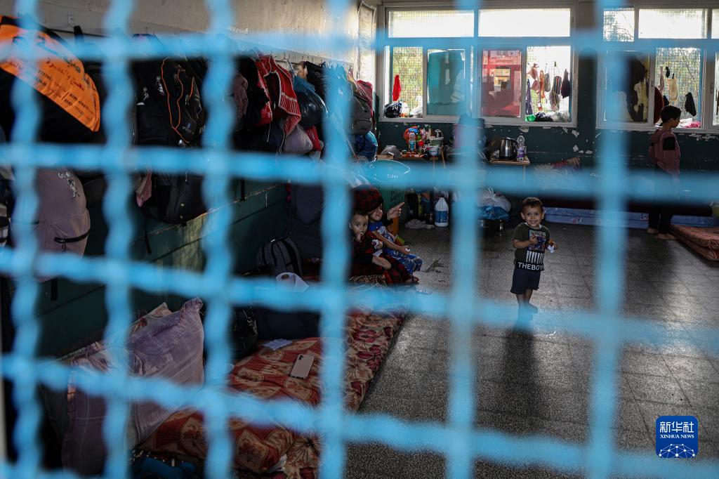 這是11月1日在加沙地帶南部城市汗尤尼斯一處臨時(shí)難民營(yíng)地拍攝的流離失所的兒童。
