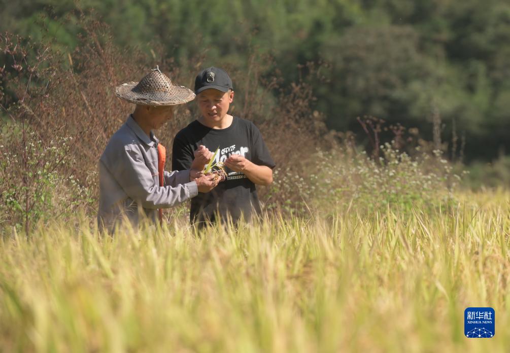 11月1日,李飛(右)和他的父親在水稻田里查看水稻的長(cháng)勢。