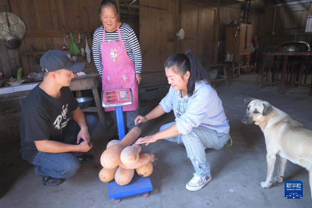 11月1日,李飛(左)和妻子(右)在村民家里收購農產(chǎn)品。