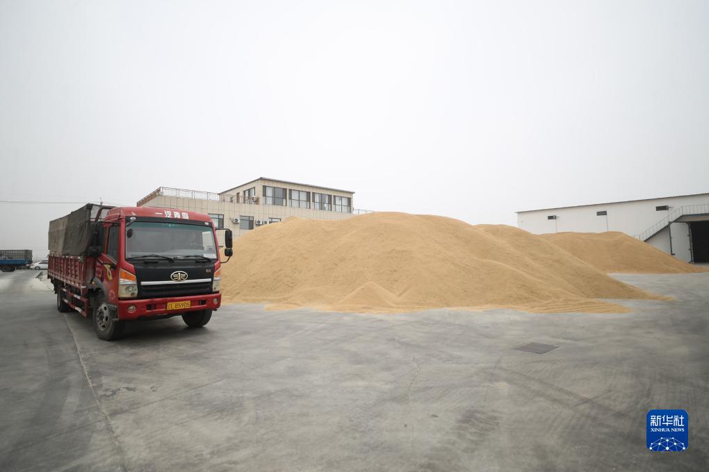11月2日,農戶(hù)將收獲的稻谷送往盤(pán)錦市大洼區一家糧食加工企業(yè)(無(wú)人機照片)