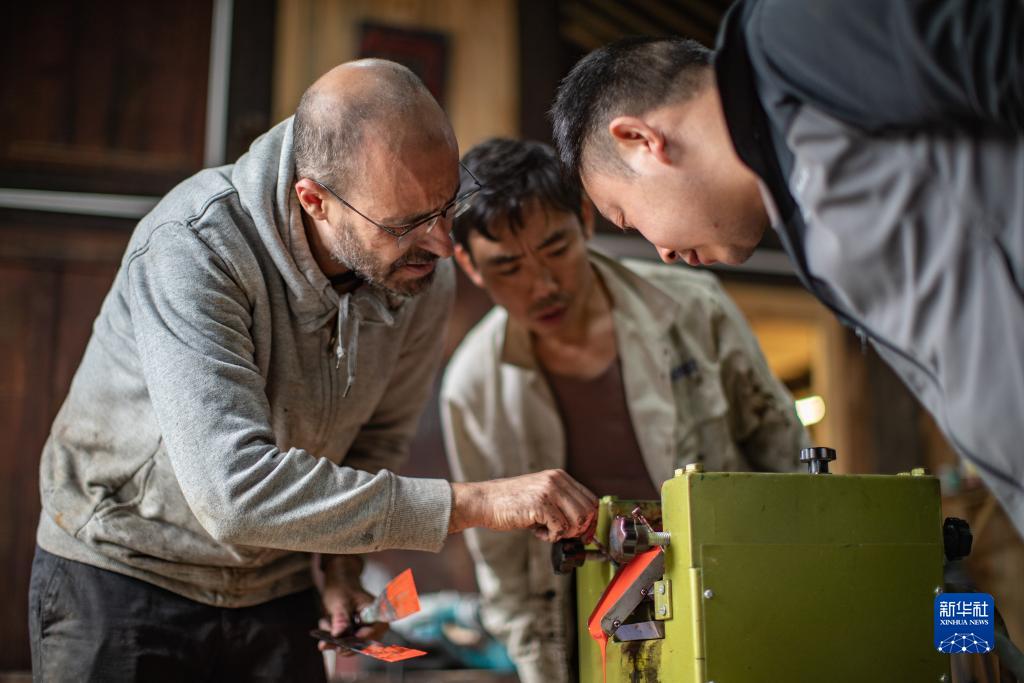 9月21日,在重慶市城口縣北屏鄉松柏村,文森(左)在工作室內指導徒弟鄭永平(中)查看紅漆研磨狀態(tài)。