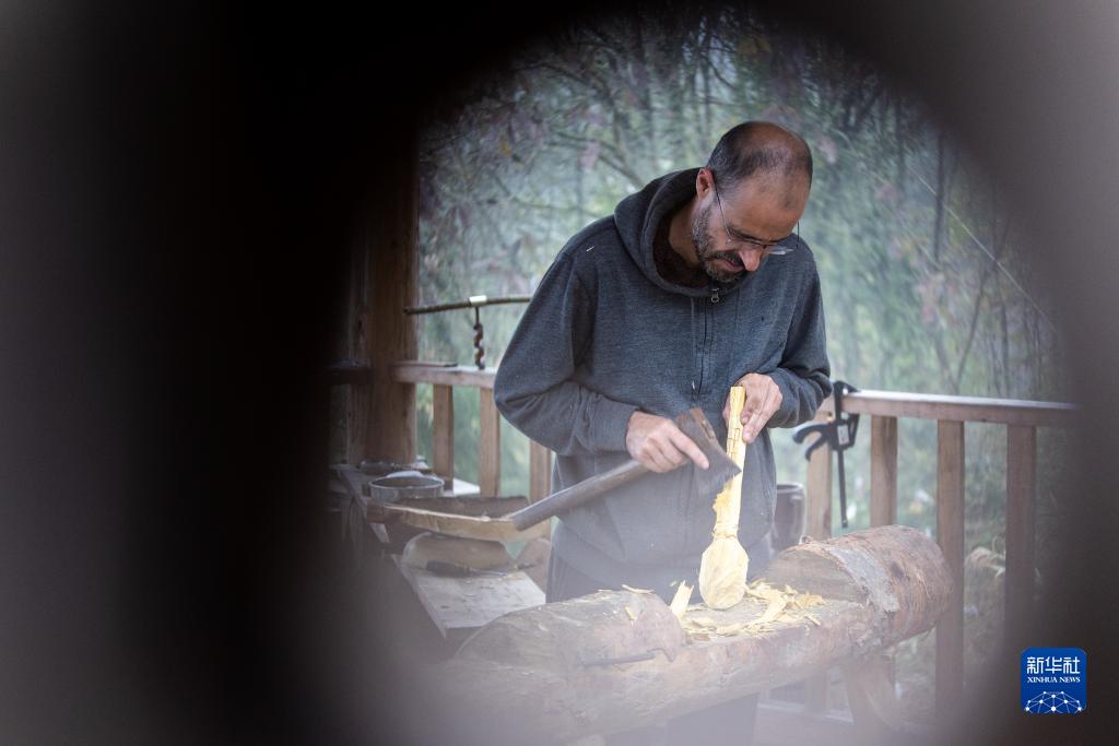 10月25日,在重慶市城口縣北屏鄉松柏村,文森在工作室外用取自漆樹(shù)的木材制作漆勺。