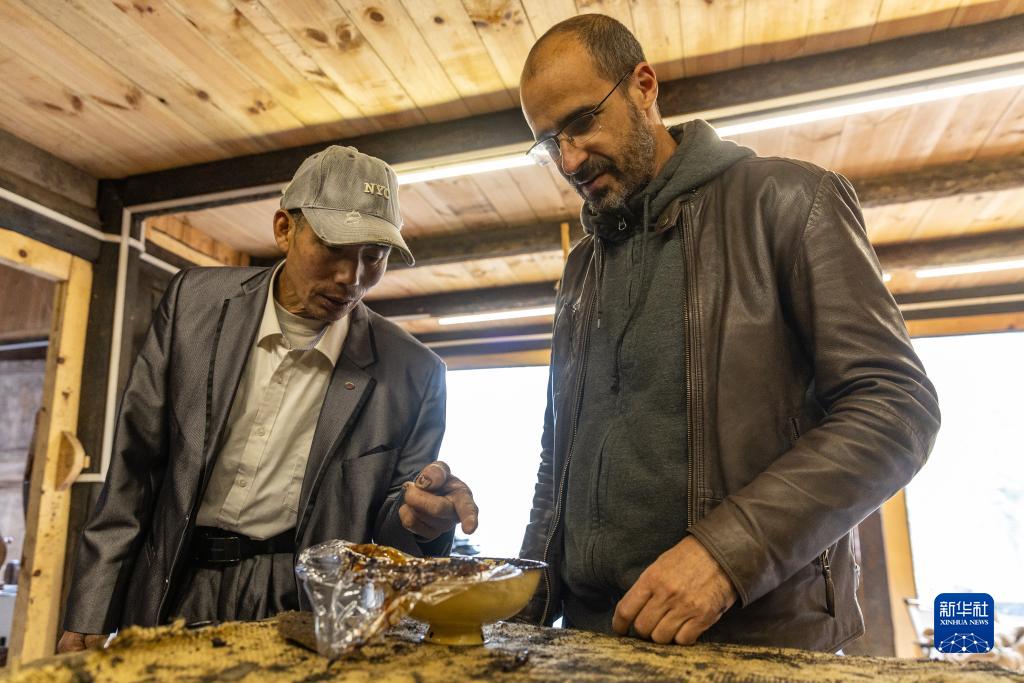 10月26日,在重慶市城口縣北屏鄉松柏村,文森(右)在工作室向他的師父割漆匠楊天倫展示今年割的漆。