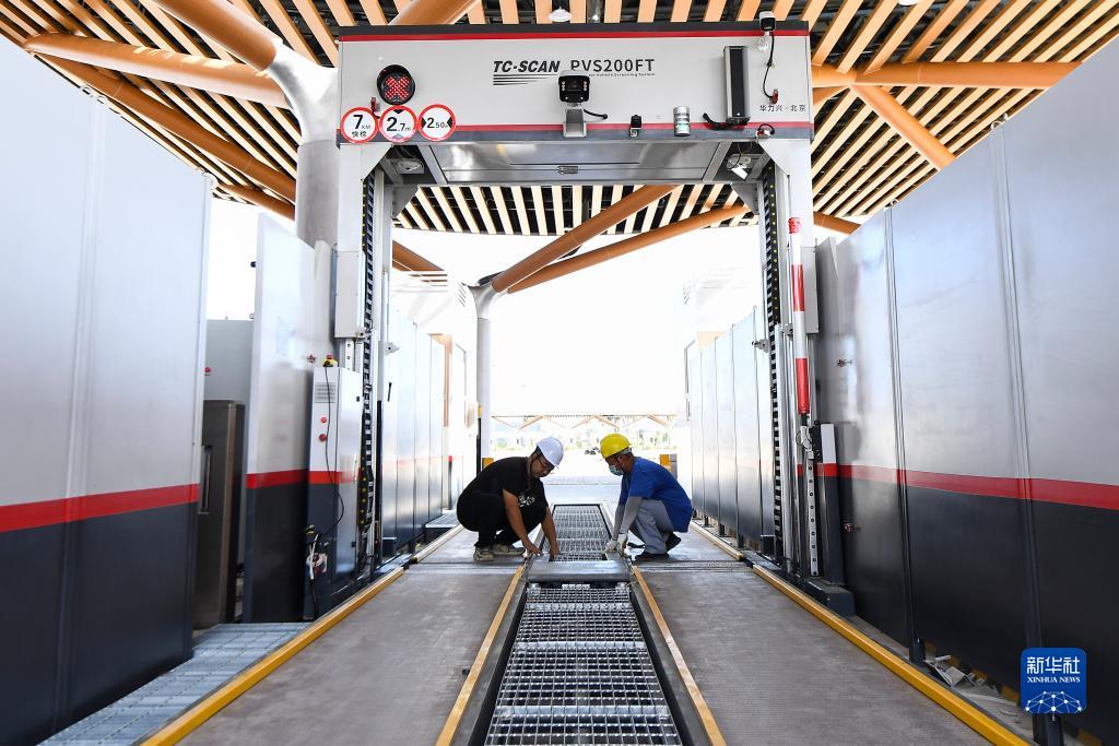 11月3日,工人在??谛潞8酆湍细邸岸€(xiàn)口岸”(客運)客運查驗設施、設備建設項目上進(jìn)行調試安裝。