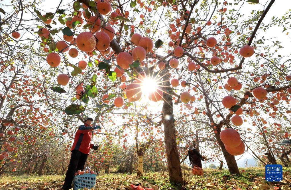 11月4日,河北省平山縣孟家莊鎮元坊村的農民在蘋(píng)果種植基地采收蘋(píng)果。