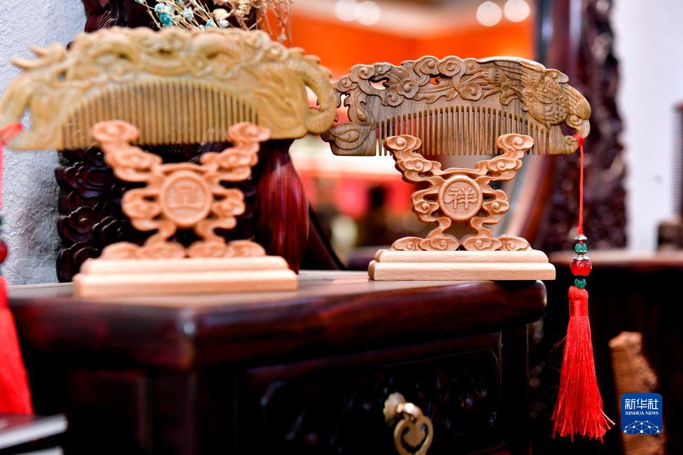 這是在嘉祥縣一家木雕生產(chǎn)企業(yè)的木梳藝術(shù)館里拍攝的藝術(shù)木梳(11月3日攝)。