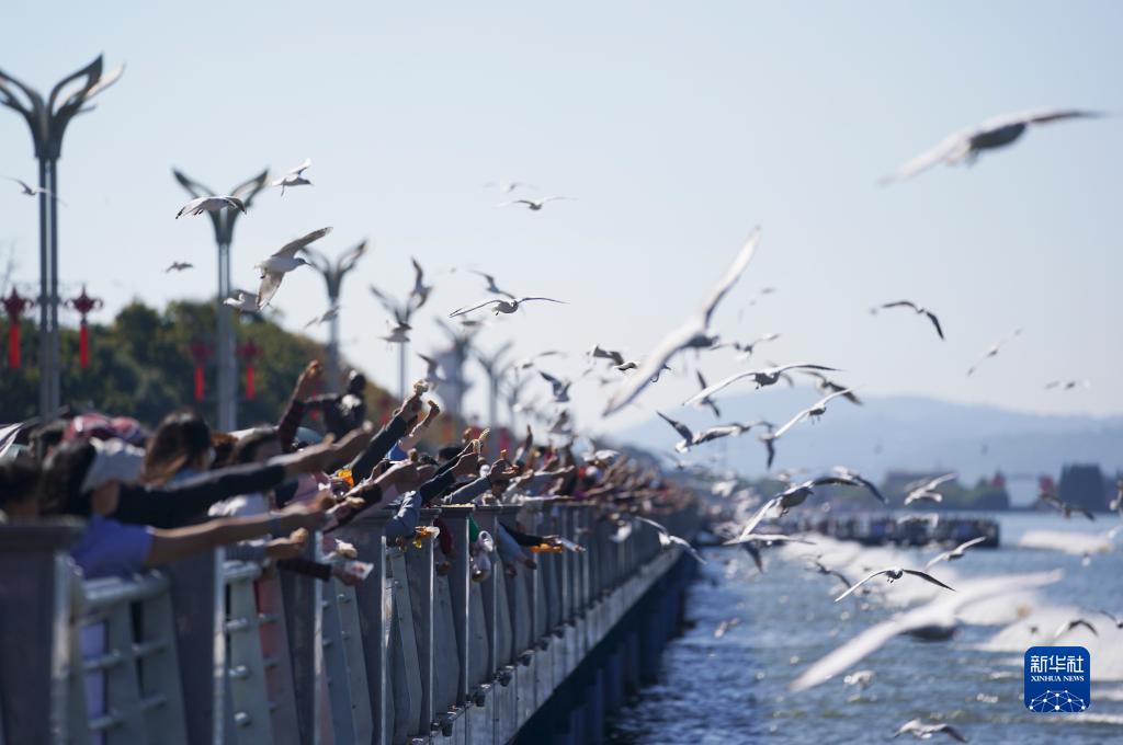 11月4日,游客在昆明滇池海埂觀(guān)景大道觀(guān)賞紅嘴鷗。