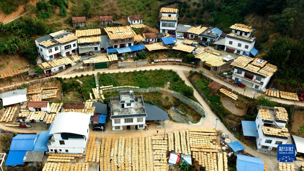 11月3日,在廣西田林縣六隆鎮平細村,村民利用晴好天氣在房前屋后曬八渡筍(無(wú)人機照片)。
