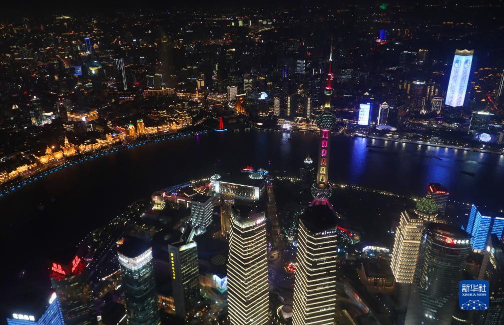 11月3日,從上海中心觀(guān)光廳俯瞰市區夜景,浦西白玉蘭廣場(chǎng)(右上)在樓身上亮起第六屆進(jìn)博會(huì )宣傳彩燈。