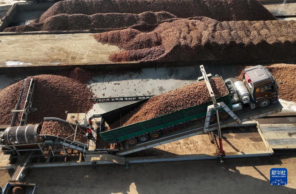 11月4日,河北省盧龍縣一家甘薯深加工企業(yè)的工人在卸載從農民手中收購的甘薯(無(wú)人機照片)。