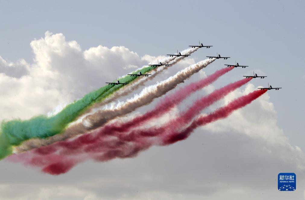 11月4日,意大利“三色箭”飛行表演隊噴出象征國旗三色的煙霧飛過(guò)羅馬上空,慶祝國家團結日。