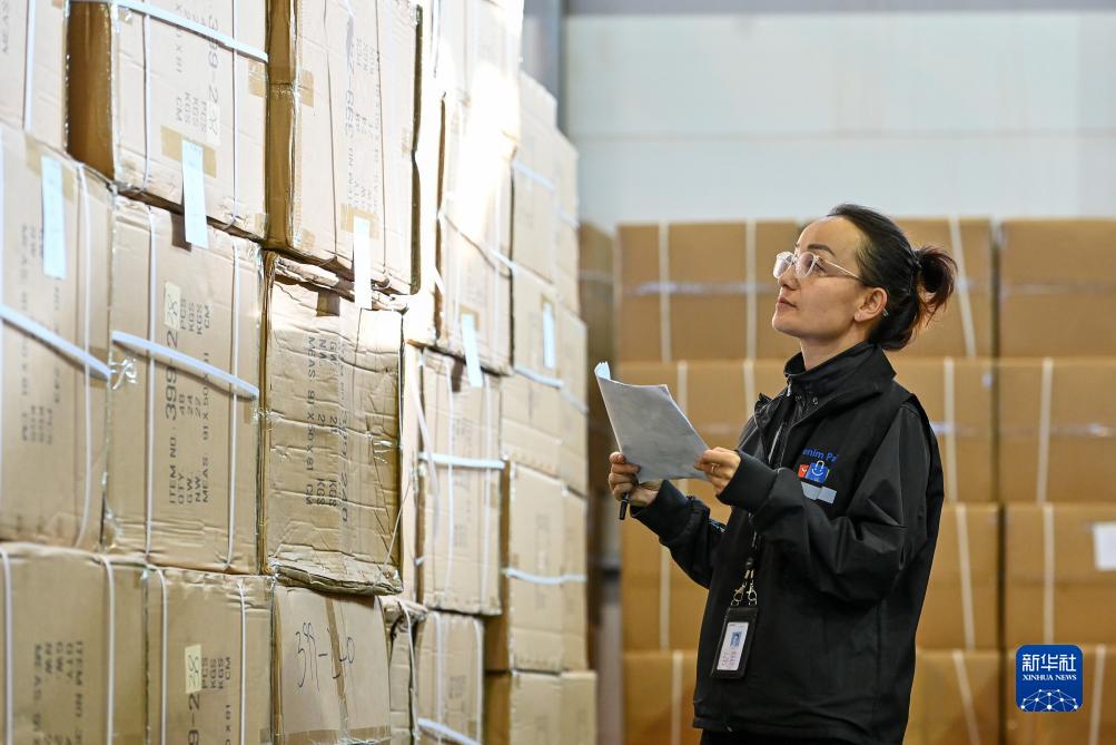庫管員在新疆喀什綜合保稅區內的中順電子跨境電商貨物分揀中心核對出口的貨物(11月4日攝)。