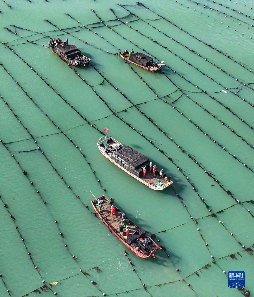 11月4日,在榮成市俚島灣海域鮑魚(yú)養殖區,養殖戶(hù)駕駛漁船捕撈鮑魚(yú)(無(wú)人機照片)。