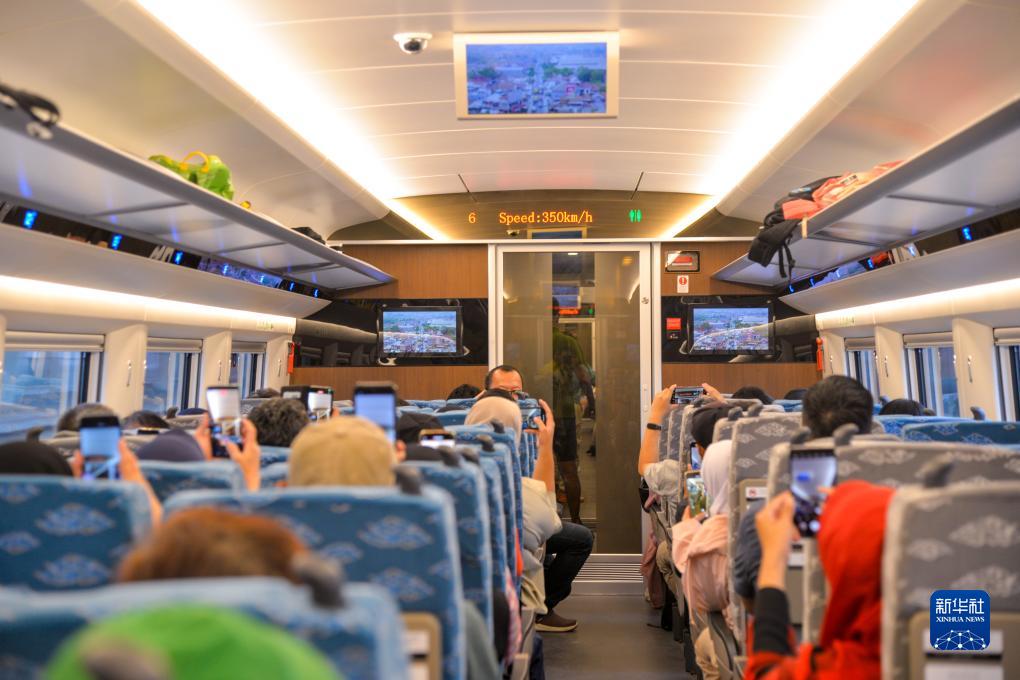 11月5日,乘客紛紛用手機在行駛中的雅萬(wàn)高鐵高速動(dòng)車(chē)組列車(chē)車(chē)廂內拍攝顯示列車(chē)時(shí)速達到350公里的電子屏。