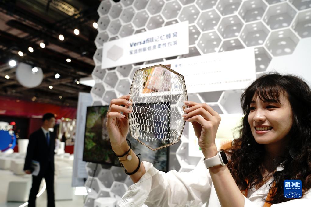 11月5日,在第六屆進(jìn)博會(huì )消費品展區寶潔展臺,工作人員介紹全球首發(fā)的“記憶蜂窩”創(chuàng )新紙質(zhì)柔性包裝產(chǎn)品。