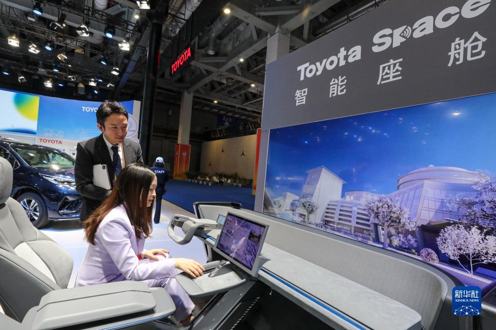 11月5日,媒體記者在第六屆進(jìn)博會(huì )汽車(chē)展區體驗豐田公司的智能座艙。